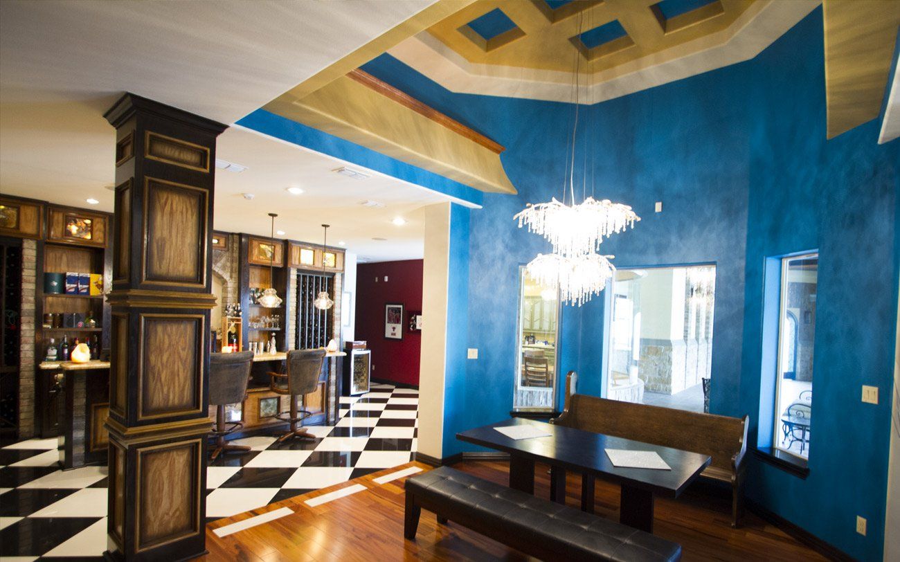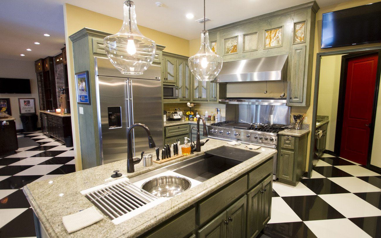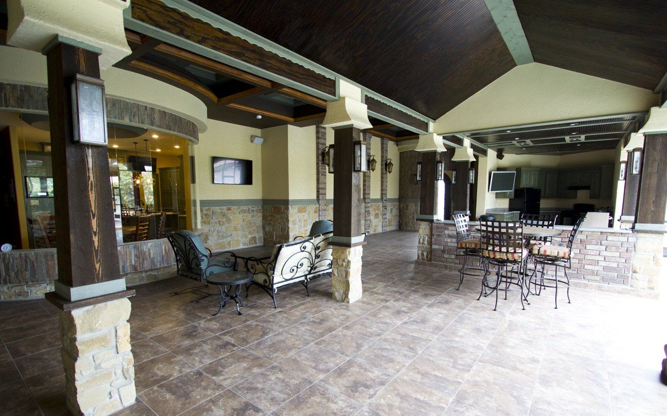 When you walk into the house, you’re actually still outside, in a covered walkway that features an outdoor kitchen, bar, TVs and heated pool. This is just another example of all the custom home work we do. You dream it, we build it!